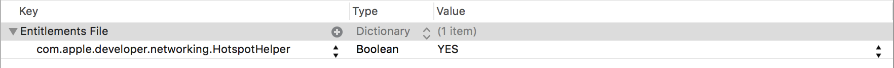 Demo.entitlements(Demo是项目名称) 里添加 Key-Value: com.apple.developer.networking.HotspotHelper -> YES